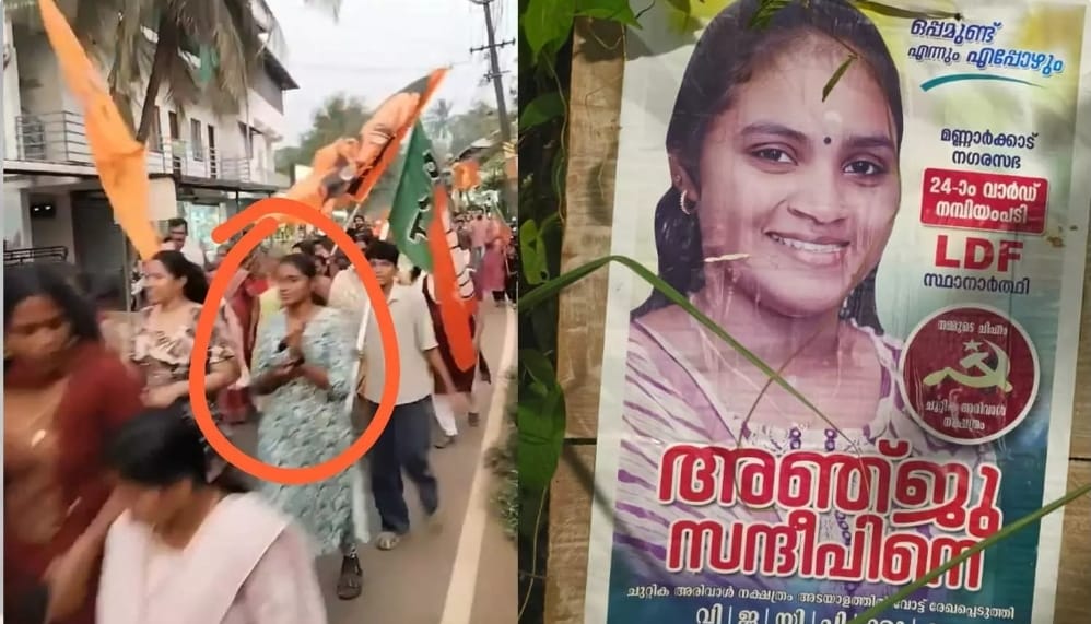 നഗരസഭയിലെ 24-ാം വാർഡിലെ നമ്പിയംപടിയിലെ സ്ഥാനാർഥി അഞ്ജു സന്ദീപാണ് ബിജെപിയുടെ വിജയാഹ്ലാദത്തിൽ പങ്കെടുത്തത്.അരിവാൾ ചുറ്റിക നക്ഷത്രം അടയാളത്തിലായിരുന്നു അഞ്ജു സന്ദീപ് മത്സരിച്ചത്.