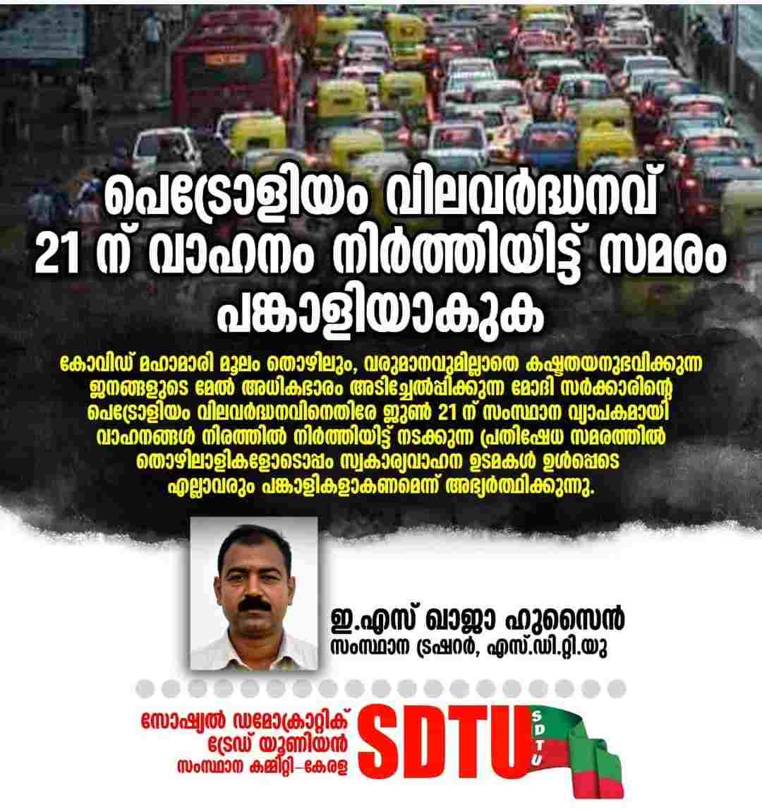 പാലക്കാട്.കോവിഡ് മഹാമാരി മൂലം തൊഴിലും, വരുമാനവുമില്ലാതെ കഷ്ടതയനുഭവിക്കുന്ന ജനങ്ങളുടെ മേൽ അധികഭാരം അടിച്ചേൽപ്പിക്കുന്ന മോദി സർക്കാരിൻ്റെ പെട്രോളിയം വിലവർദ്ധനവിനെതിരേ 2021 ജുൺ 21 ന് സംസ്ഥാന വ്യാപകമായി വാഹനങ്ങൾ നിരത്തിൽ നിർത്തിയിട്ട് നടക്കുന്ന പ്രതിഷേധ സമരത്തിൽ തൊഴിലാളികളോടൊപ്പം സ്വകാര്യവാഹന ഉടമകൾ ഉൾപ്പെടെ എല്ലാവരും പങ്കാളികളാകണമെന്ന് സോഷ്യൽ ഡമോക്രാറ്റിക് ട്രേഡ് യൂണിയൻ സംസ്ഥാന ട്രഷറർ ഇ.എസ് ഖാജാ ഹുസൈൻ അഭ്യർത്ഥിച്ചു