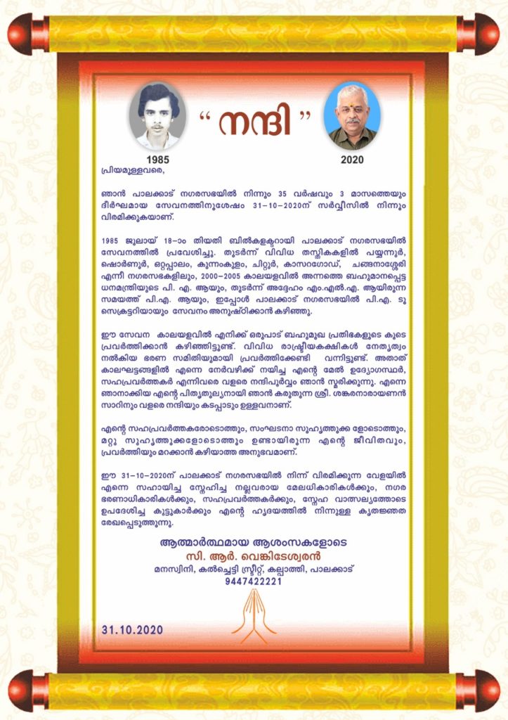 പക്വതയോടും സൗമൃതയോടും പെരുമാറിയിരുന്ന ഉദ്യോഗസ്ഥനായിരുന്നു സി.ആർ.വെങ്കിടേശനെന്നും നഗരസഭയിലെത്തുന്ന എല്ലാവർക്കും ഒരു മാർഗ്ഗ ദർശികൂടിയായിരുന്നെന്നും നഗരസഭ ചെയർപേഴ്സൻ പ്രമീള ശശിധരൻ പറഞ്ഞു.